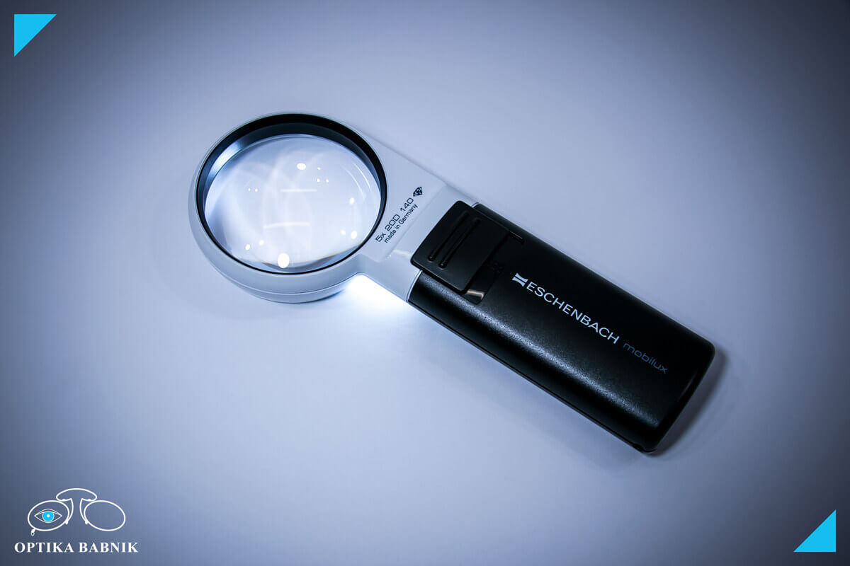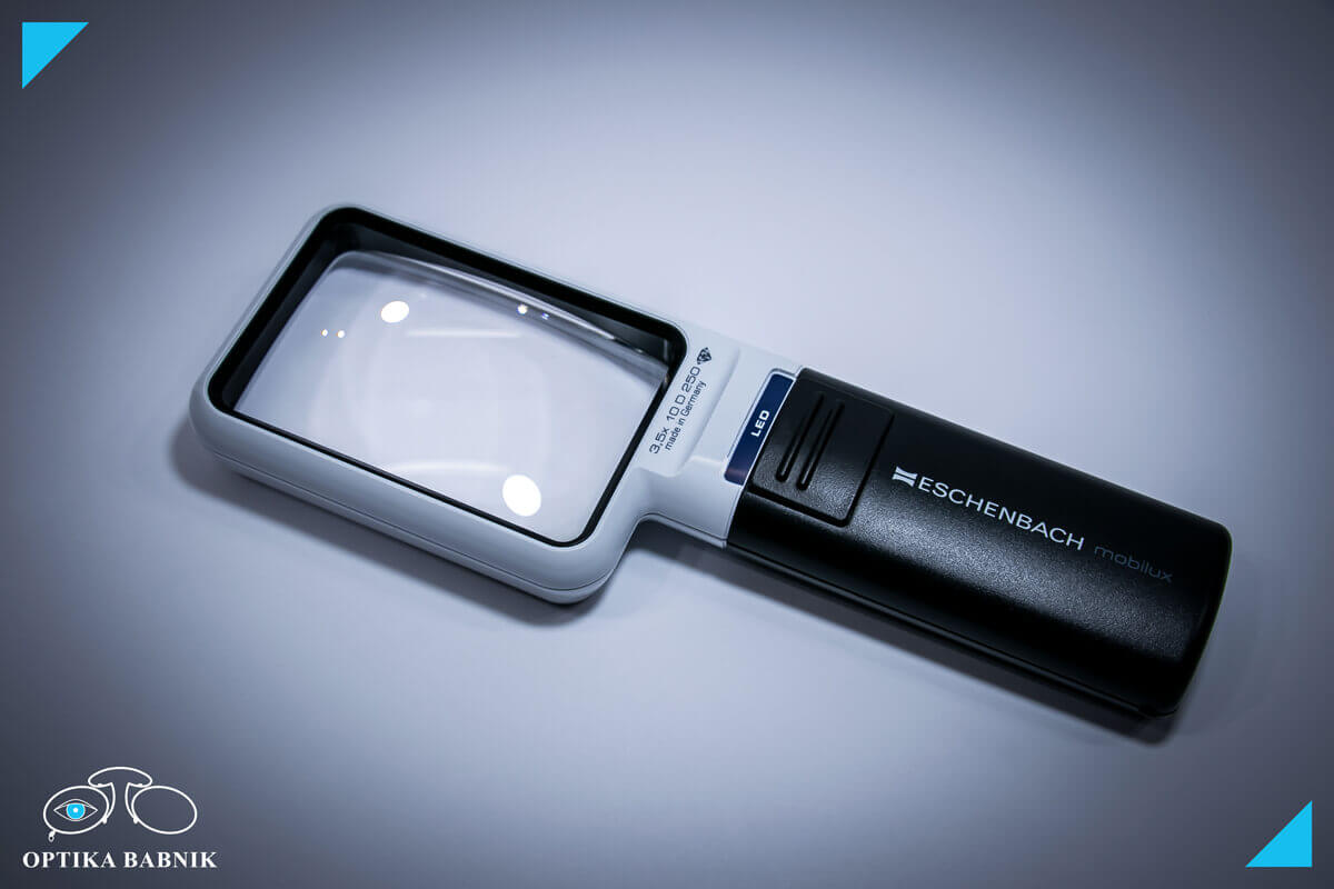 V optiki nudimo lupe nemškega proizvajalca Eschenbach. Na voljo so različni modeli, ki imajo moč (povečavo) od 2x do 12,5x. Za bolj udobno branje so lupe opremljene z LED osvetlitvijo, življenjska doba svetila pa znaša 50.000 ur. Baterije je enostavno zamenjati, ob nakupu pa je set baterij priložen. V ponudbi so tudi elektronske lupe s povečavo od 2x do 22x, ter navadne lupe brez osvetljave, različnih dimenzij in povečav.