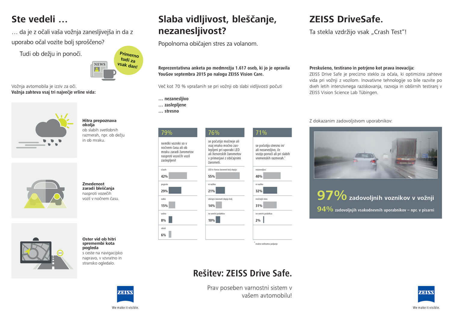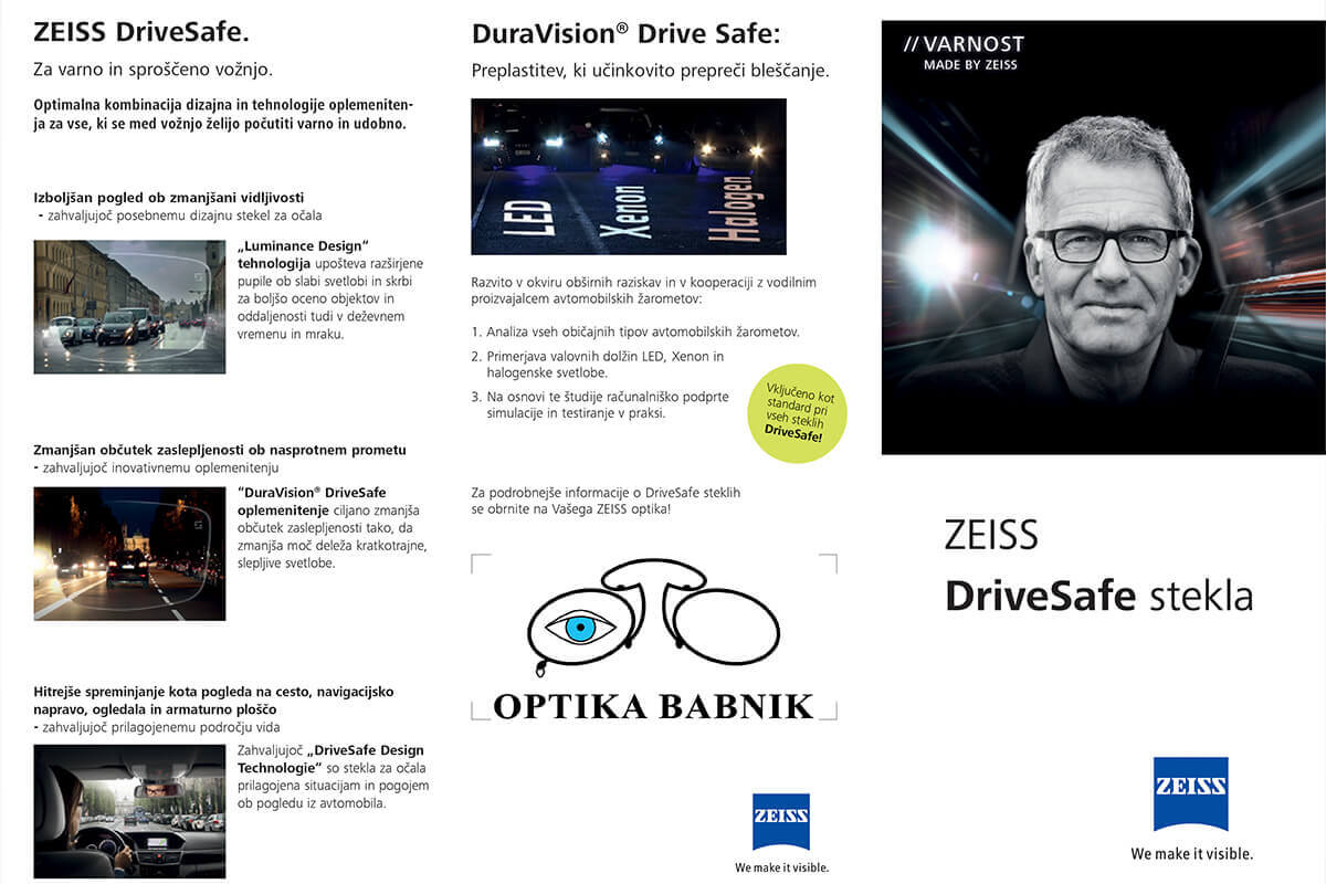 V optiki nudimo očalne leče najvišje kvalitete. Sodelujemo z nemškim proizvajalcem Zeiss, ki je eno izmed vodilnih podjetij na področju optike, optičnih pripomočkov in fizikalnih meritev svetlobe. Izbirate lahko med vsemi variantami enožariščnih in progresivnih leč (branje, pisarna, vožnja, šport, računalnik, delo, itd.) in dodatnim nanosom, kot je antirefleks (sloj proti bleščanju + višja prepustnost svetlobe), trdnostni sloj (zmanjšuje možnost prask na leči), filter modre svetlobe in premaz za lažje čiščenje in nego leč. Vse očalne leče Zeiss nudijo 100 % UV zaščito, ki je postala standard pri brezbarvnih očalnih lečah podjetja.